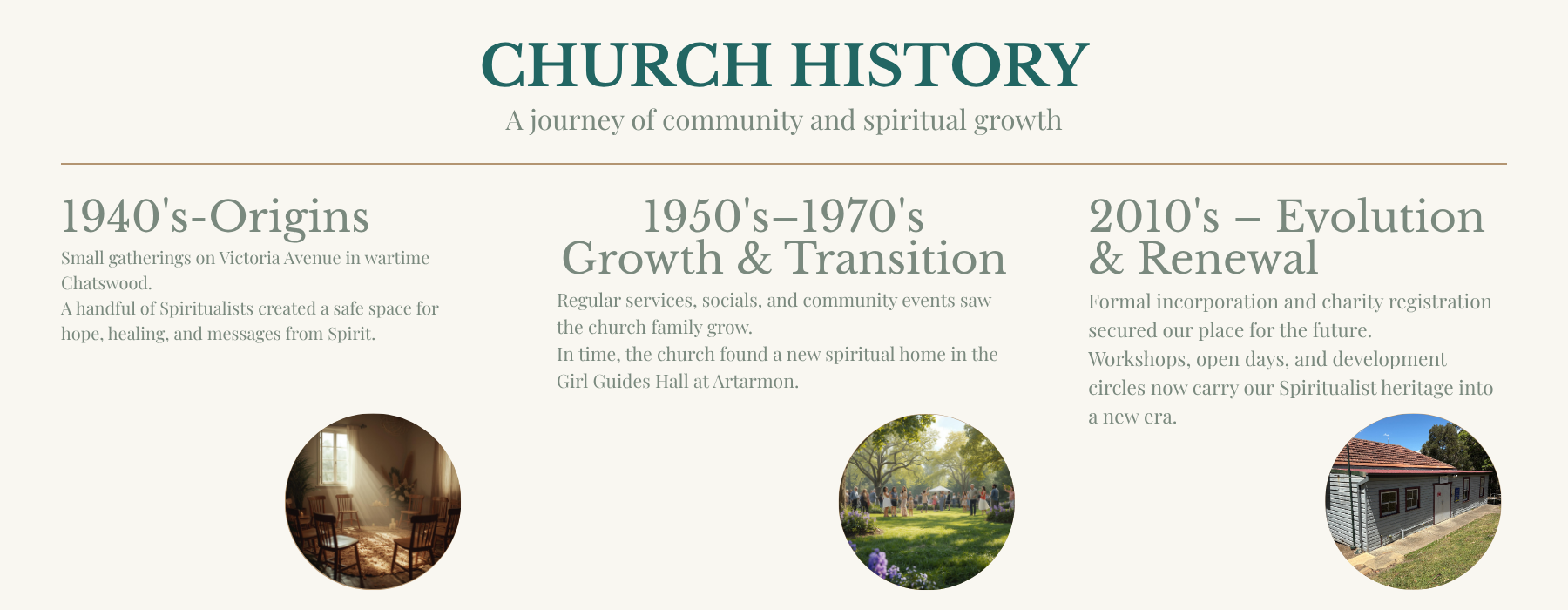 Our story begins in the early 1940s, when a small group of Spiritualists began gathering in a room at 430 Victoria Avenue, Chatswood. At a time marked by war and uncertainty, these early pioneers created a space where people could find comfort, evidence of life beyond physical death, and the healing presence of Spirit.